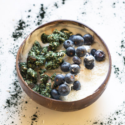 - Le Spirukrunch – à base de sarrasin, noix de coco et de dattes agrémenté de spiruline et de vanille.