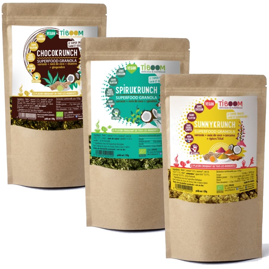 Un assortiment des 3 granolas Bio et croquants Tiboom. Des granolas vegan, bio et gourmands. Dans les transports, au travail, avant, pendant et après votre entraînement, lors de vos randonnées ou pour vous faire plaisir durant la journée, ils vous accompagneront tout au long de vos aventures grâce à son format pratique !